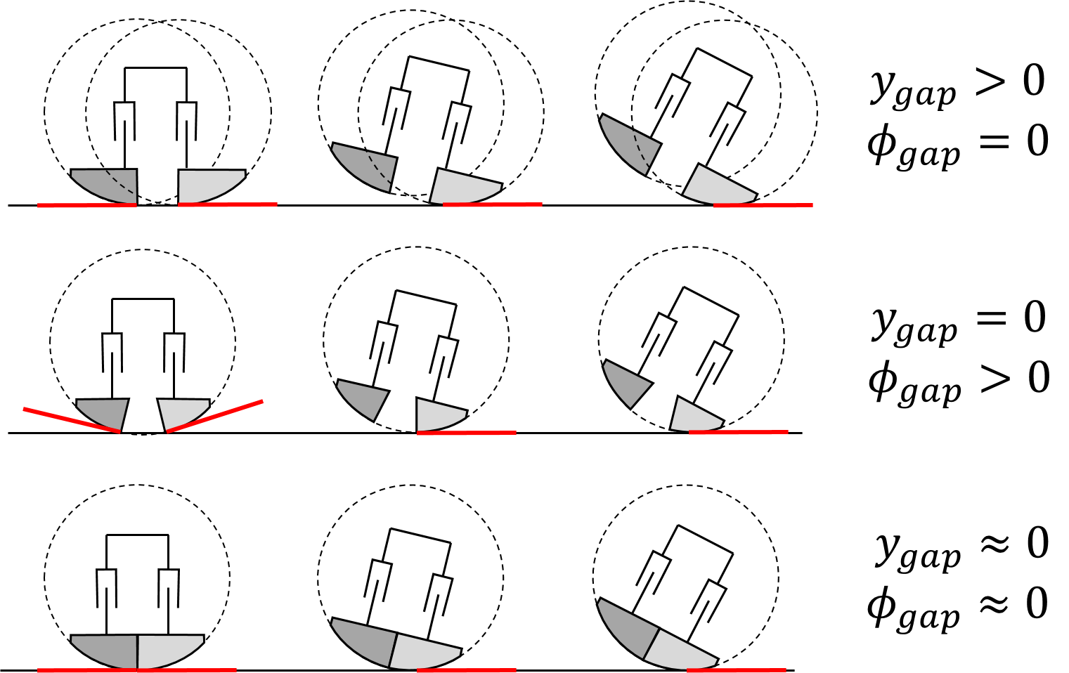 The geometry of the spherical feet is crucial to creating a stable walking gait. Our walker is unique in that the profiles of the two feet are not concentric. This design choice allows for a smooth transition between the feet as the robot rolls laterally.