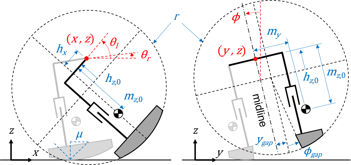 With our robot design, we use a single actuator per leg to both generate this wobble and encourage the legs to swing forward. Our walking model consists of 5 rigid bodies – a torso, two upper legs, and two spherical section feet. The hip joint is passive, but there is an actuated prismatic joint in each of the two leg.